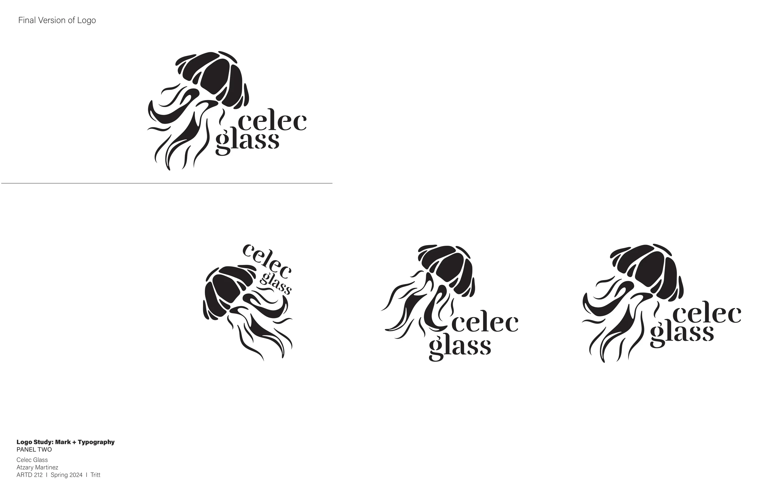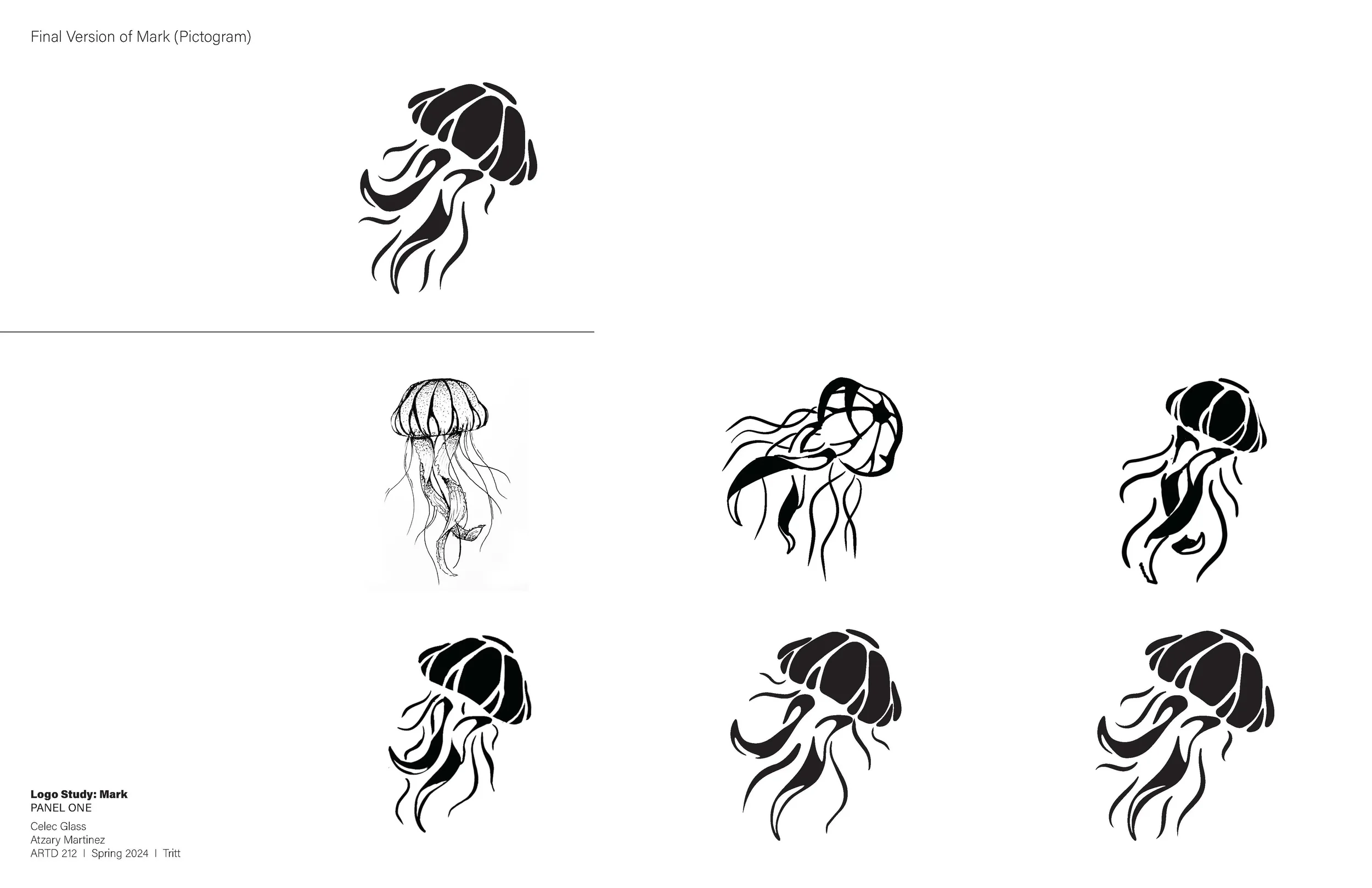 I started to draw a realistic version of a jellyfish and picked pieces apart much like glass is broken before being incorporated into the final piece. I picked a type that resembled the nature of the pictogram. I adjusted the type and the image to my liking until it felt incorporated with the brand.